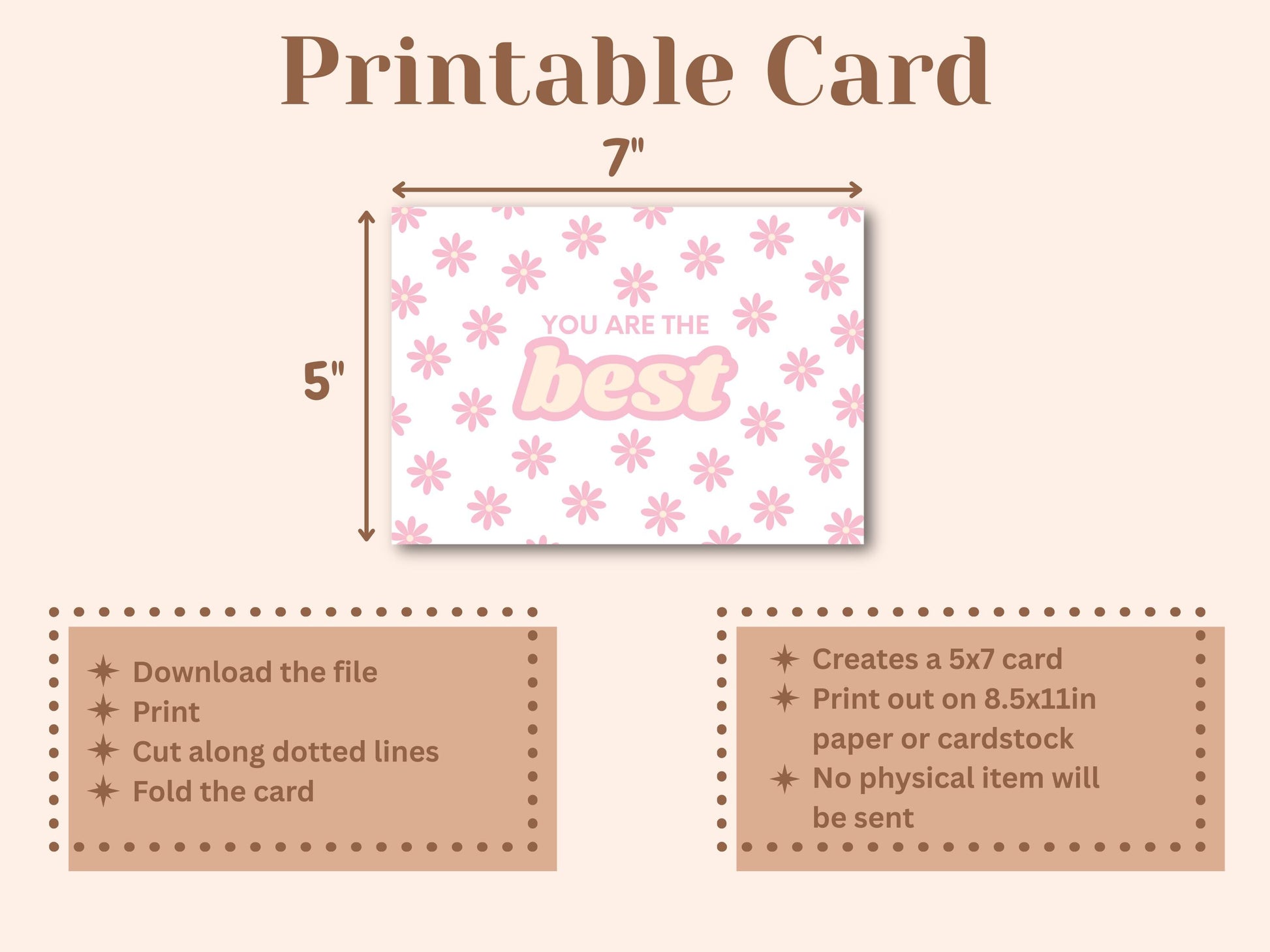 After downloading the files, you can print on either a standard 8.5"x11" piece of paper or use card stock paper for a better and more study look. Once you have the card printed out, cut along the dotted lines and then fold the paper in half. The card will be roughly 5"x7" at the end.